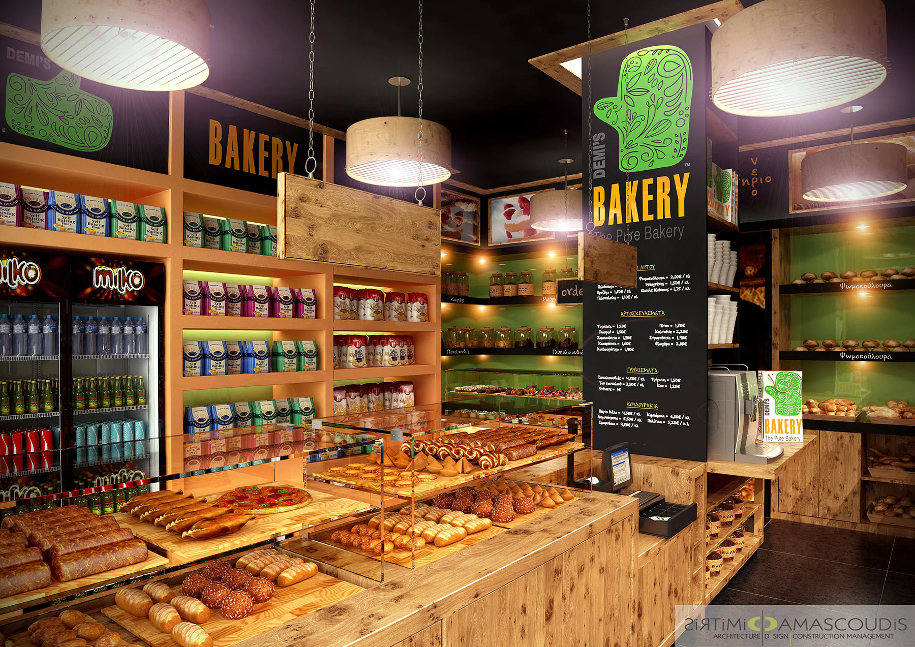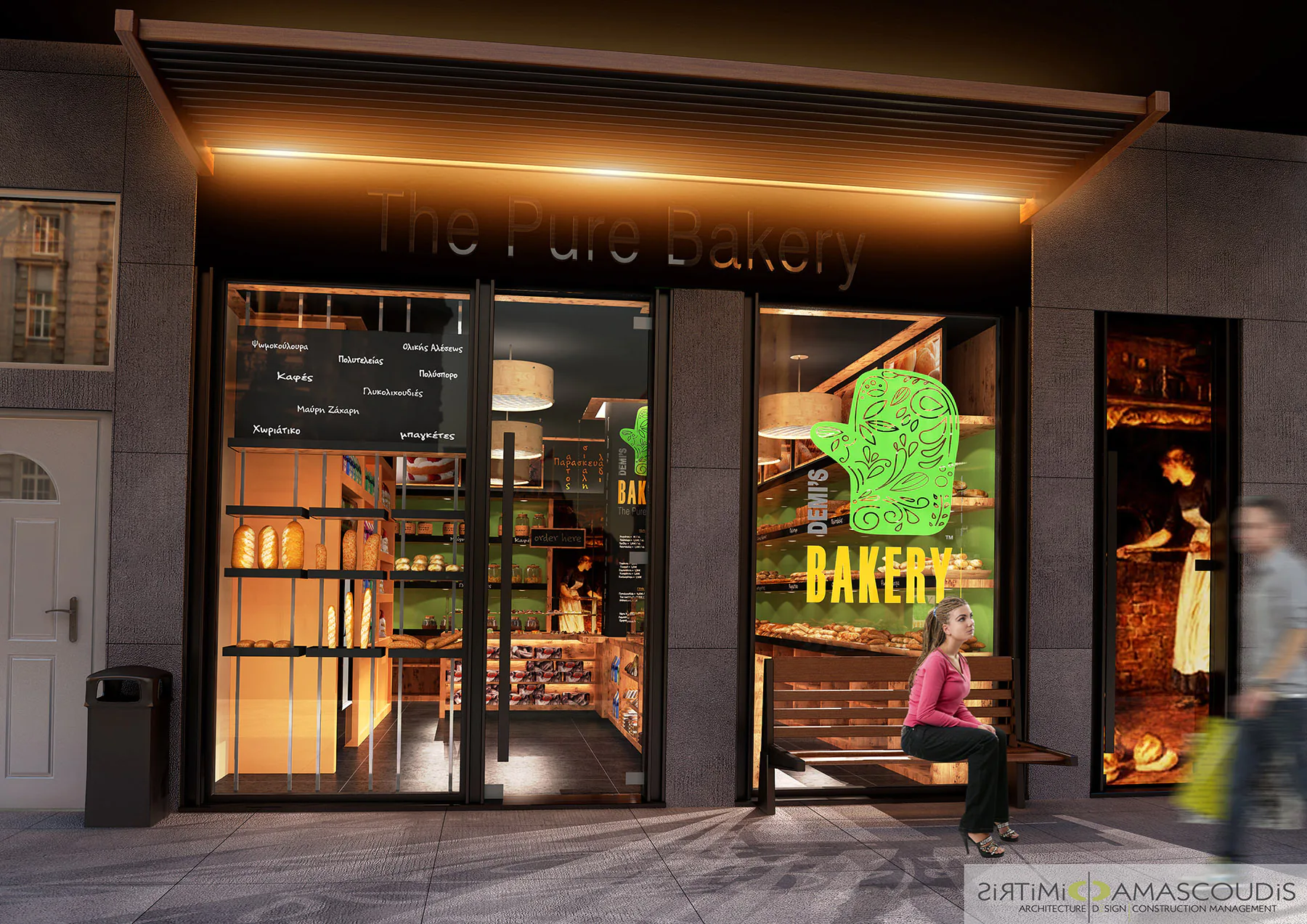 Ο σχεδιασμός του Demis Bakery (“The Pure Bakery”) υλοποιεί την αρχική ιδέα για ένα σύγχρονο και πρωτότυπο αρτοποιείο που απευθύνεται σε καταναλωτές που αναζητούν την υψηλή ποιότητα και τις υγιεινές πρώτες ύλες. Η εξωτερική του όψη συνδυάζει στοιχεία αστικής αισθητικής με θερμούς τόνους, δημιουργώντας μια ελκυστική και οικεία πρόσκληση.