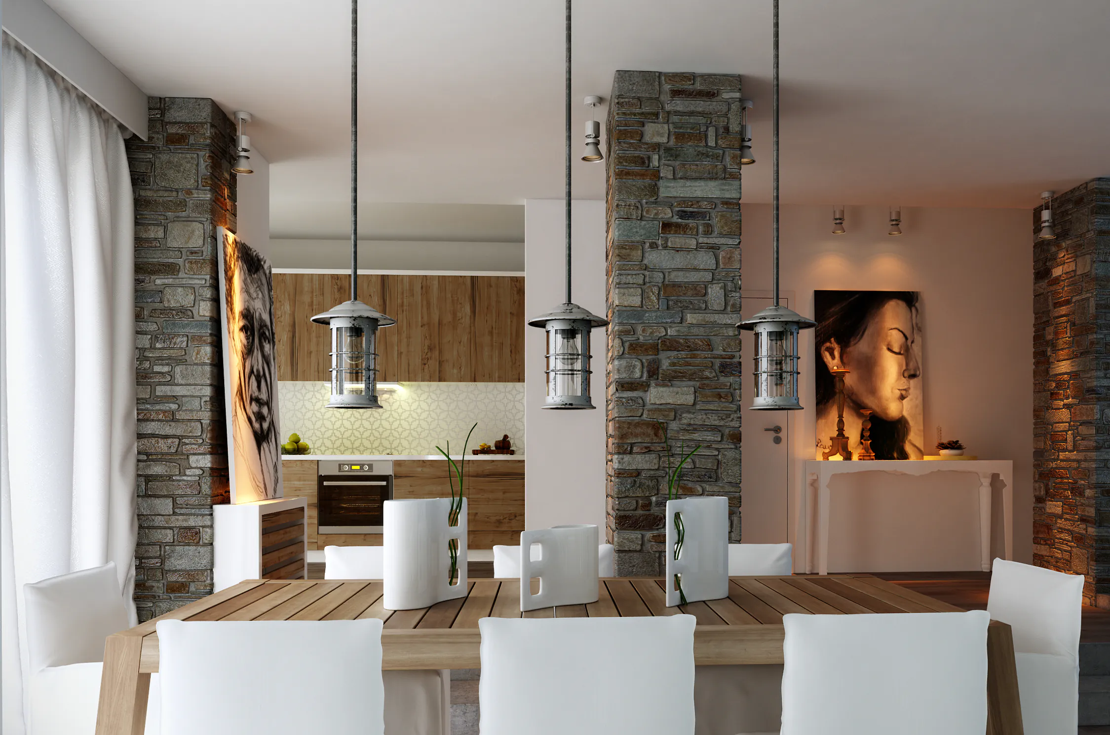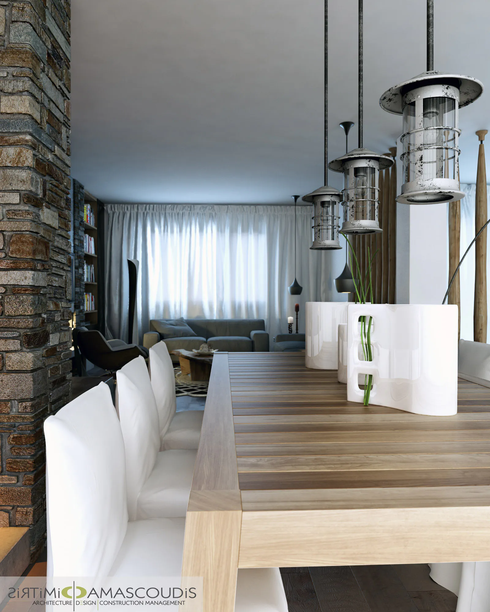 Η εσωτερική διακόσμηση της κατοικίας επιτυγχάνει μια εξαιρετικά ενδιαφέρουσα σύνθεση, συνδυάζοντας την λιτότητα του minimal με τη ζεστασιά των φυσικών υλικών του country στυλ, δημιουργώντας έναν χώρο που είναι ταυτόχρονα εκλεπτυσμένος και φιλόξενος.