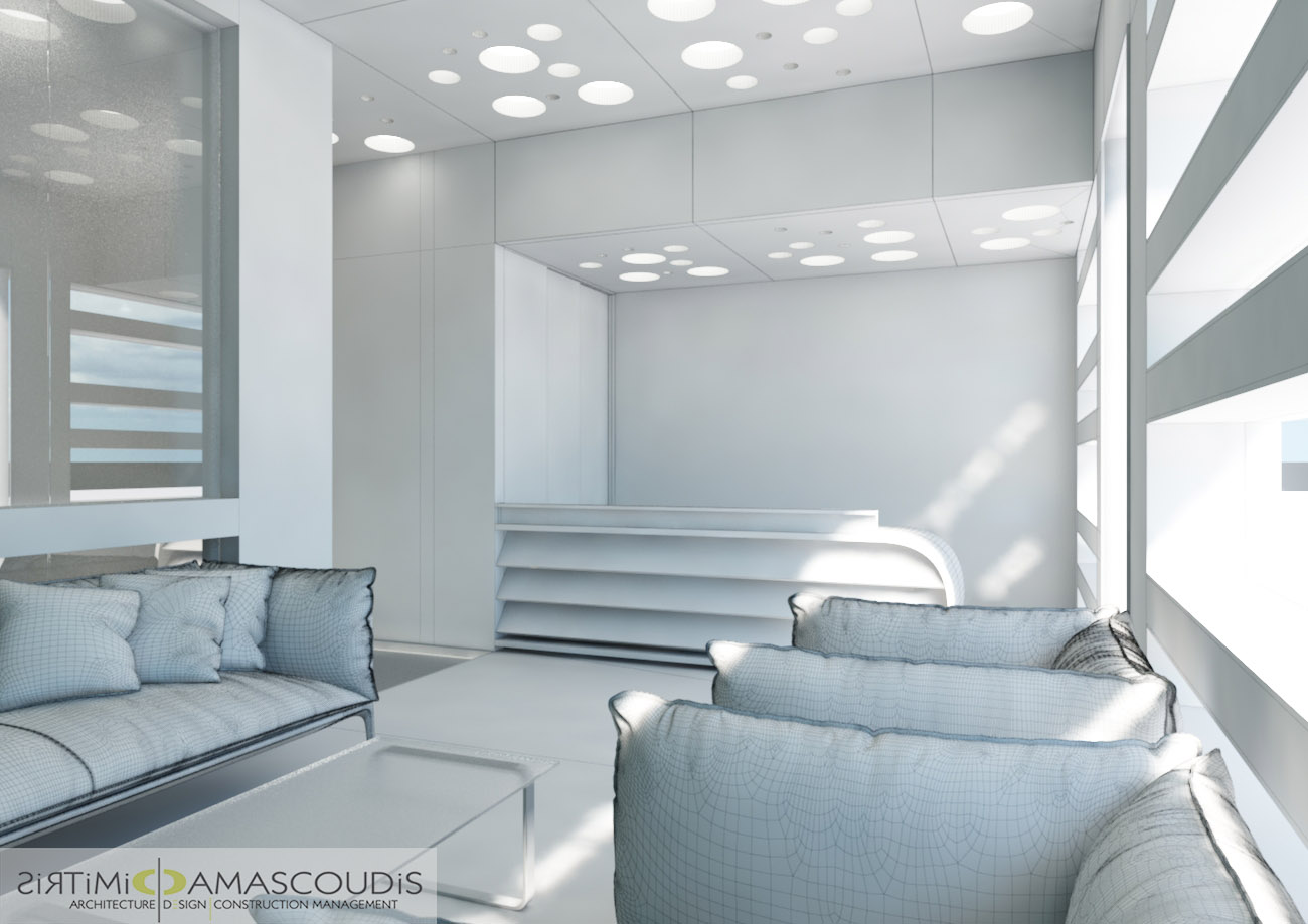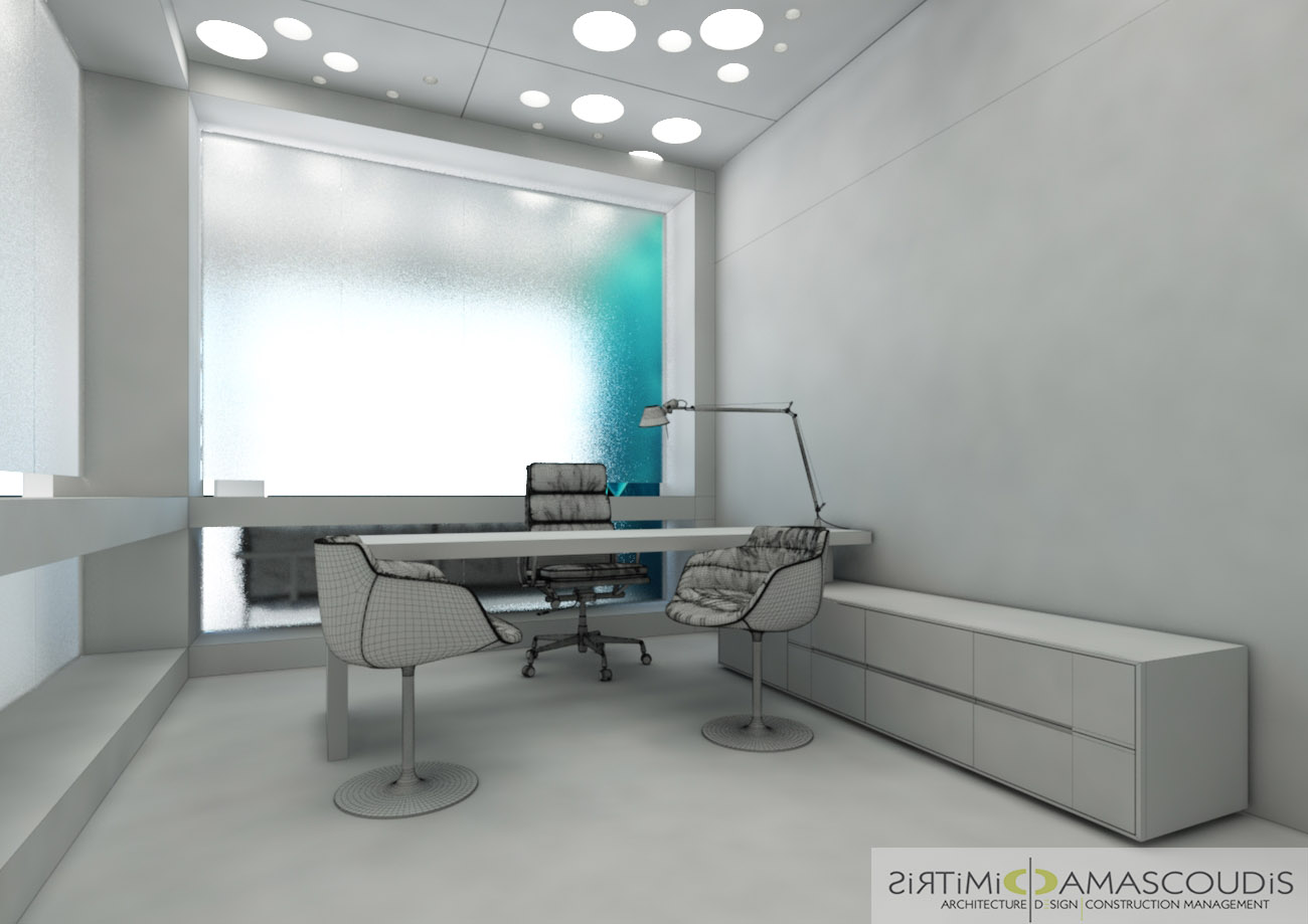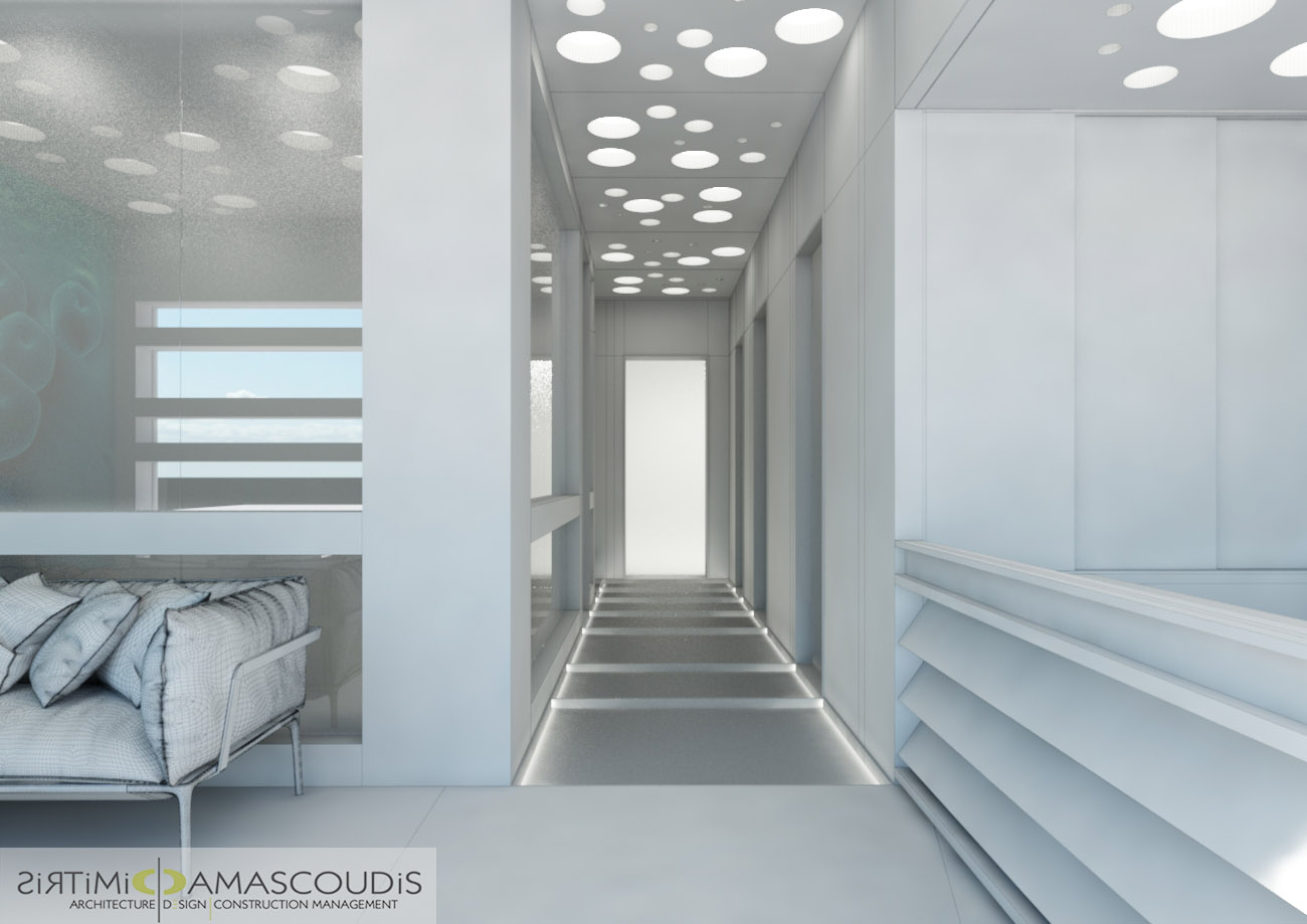 Ολόκληρος ο χώρος κυριαρχείται από το λευκό χρώμα και τις καθαρές, μίνιμαλ γραμμές, συμβολίζοντας την αποστείρωση και την ακρίβεια που είναι απαραίτητες σε ένα ιατρικό περιβάλλον. Οι τοίχοι, το δάπεδο και τα έπιπλα έχουν σχεδιαστεί για να μην υπάρχουν περιττές γωνίες ή διακοσμητικά στοιχεία που συγκρατούν σκόνη.Ένα μεγάλο παράθυρο καλύπτει τον πίσω τοίχο. Η χρήση παγωμένου (frosted) ή αμμοβολισμένου γυαλιού εξασφαλίζει τη διάχυση άπλετου φυσικού φωτός, διατηρώντας ταυτόχρονα την ιδιωτικότητα και φιλτράροντας την έντονη οπτική επαφή με το εξωτερικό.